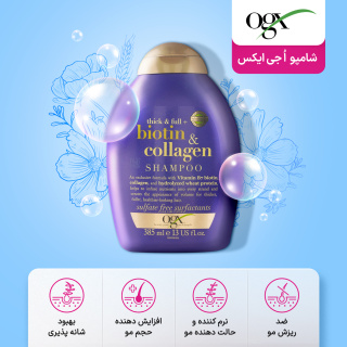 شامپو فری سولفات حاوی بیوتین و کلاژن آبرسان و احیا کننده قویogx او جی ایکس، حاوی روغن کراتین بوده که سبب تقویت و تغذیه کننده موهای آسیب دیده میشود. این محصول، ضمن پاکسازی موها و پوست کف سر به رطوبت رسانی موها کمک کرده و در رفع و کاهش خشکی آنها موثر است