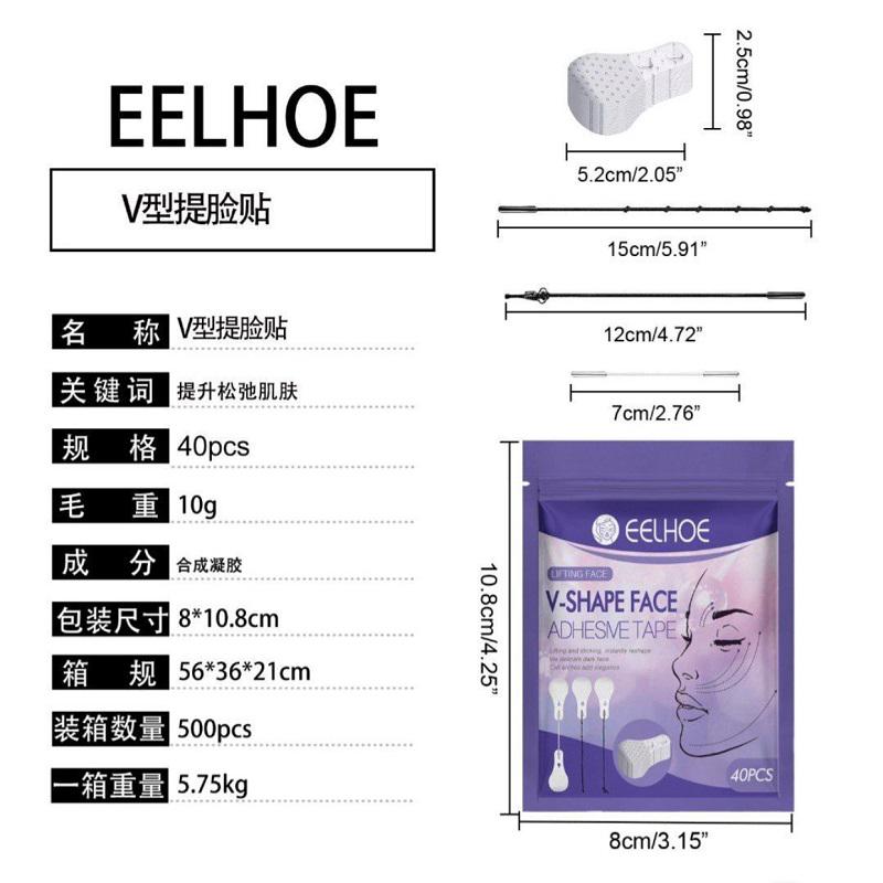 کش لیفت پوست صورت و گردن شرکت EELHOE برخلاف کش لیفتهای شانه دار باعث کشیدگی و کنده شدن موه های پیشانی و شقیقه نمیشود. همچنین از این مدل کش لیفت چسبی میشود برای کشیدن پوست گردن نیز استفاده کرد. چسبهای استفاده شده در این مدل کش لیفت کاملا نامريی و قابلیت آرایش و زدن پنکیک و کرم پود را دارد. بسته های این محصول شامل 40 عدد چسب و سه بند کش میباشد.برای بالا بردن مقاومت لایه چسب سوراخ پایه چسبها((جای اتصال بندها)) را به صورت دوبل بر روی هم قرار دهید.