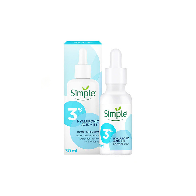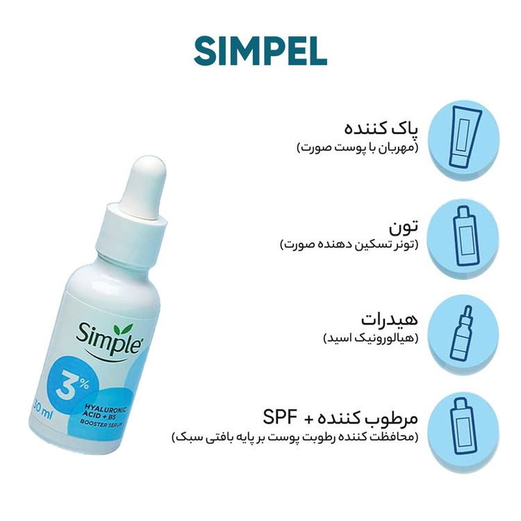 سرم Simple 3% Hyaluronic Acid + B5 روتین مراقبت از پوست شما را برای نتایج فوری و قابل مشاهده ارتقا میدهد. این سرم مرطوب کننده یک محصول فوق العاده برای درمان پوست دهیدراته و آسیب دیده شماست. سرم Simple 3% Hyaluronic Acid + B5 علاوه بر آبرسانی پوست خشک، تنظیم تولید چربی و بهبود بافت پوست، نقاط تحریک شده پوست را به سرعت تسکین میدهد. این سرم با 3٪ مواد فعال عرضه شده است، که شامل 0.5٪ اسید هیالورونیک فعال، 0.5٪ PENTAVITIN فعال و 2.5٪ پروویتامین بی فعال است. ترکیب موثر این مواد برای ایجاد پوستی نرم، لطیف و شاداب کافی است. این سرم مانند دیگر محصولات سیمپل، تحت آزمایش های پوستی فراوان قرار گرفته است و حاوی هیچ ماده شیمیایی مضری نبوده و بدون الکل، روغنهای معدنی، رنگهای مصنوعی و عطر است. علاوه بر این، این سرم آرایشی سیمپل توسط PETA تأیید شده و وگان است. برای استفاده از این سرم، بعد از شستشوی پوست، چند قطره از آن را روی پوست تمیز و مرطوب صورت و گردن بزنید.