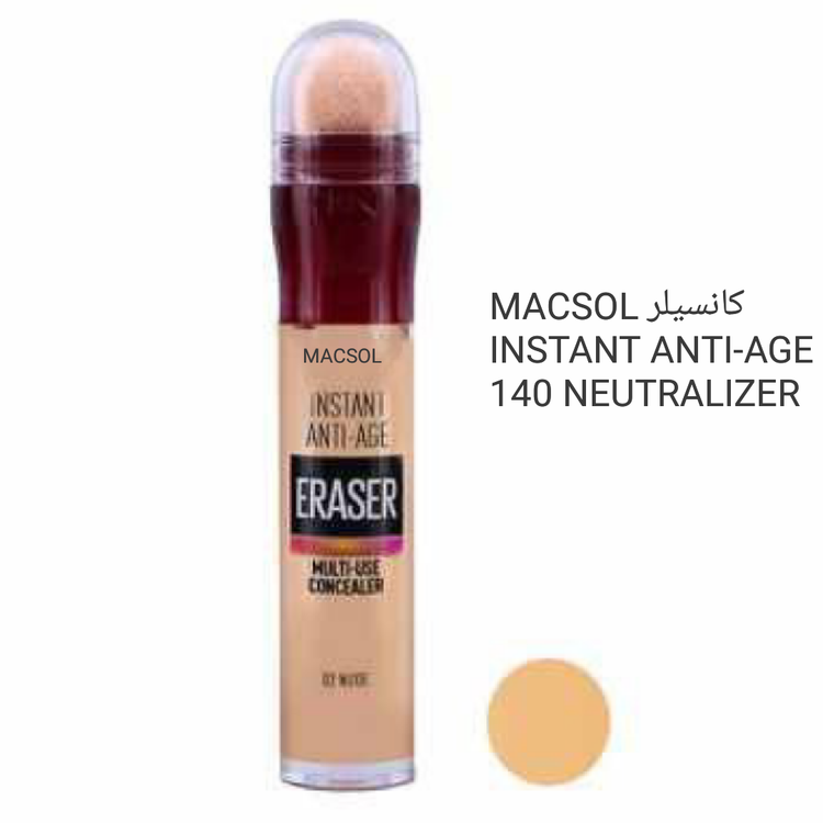 طراوت دهنده - ضد خستگی - ضد پیری - ضد چروک - مناسب برای پوشاندن لک و جوش - ضد حساسیت - حاوی گوجی بری و هالوکسیل برای جلوگیری از پیری کانسیلر ضد پیری (Anti-Age) مکسول macsol با دارا بودن فرمولاسیون فعال هالوکسیل که در کاهش ظاهر پف و سایه های اطراف چشم موثر است؛ خطوط دور چشم ،تیرگی و پف را پوشانده و پوست را نرم و لطیف می کند و در حال حاضر پر طرفدارترین کانسیلر در ایران میباشد. پوشانندگی این محصول بسیار بالا بوده و با مقدار کمی از مایع آن، نتیجه بسیار مطلوبی حاصل می گردد و در نهایت پوستی یک دست و شفاف به ارمغان میآورد. این محصول به صورت سرخود دارای پد بوده که سهولت استفاده و حمل آنرا بیشتر مینماید.طراحی کاربردی میکروفیل اسفنج این محصول به گونه ای است که پوشش خود را بر کوچکترین حفره های پوست صورت نیز اعمال می کند. این پد کاملا آنتی باکتریال است. همچنین عملکرد پد این محصول از سوی بررسی کنندگان این محصول بسیار خوب ارزیابی شده است. کانسیلر Instant Anti-Age Eraser مکسول با از بین بردن چین و چروک و پف دور چشم که ناشی از خستگی یا افتادگی پوست است، همراه با خاصیت لیفتینگ پوست دور چشم، برای شما زیبایی و جذابیت به همراه میآورد. برتری این کانسیلر در پوشاندن کامل سایههای دور چشم، لیفتینگ پوست بوده، ضدحساسیت است و برای انواع پوست خشک، معمولی و چرب مناسب است. شماره 140NEUTRALIZERکه برای پوستهای متوسط و گندمگون بسیار مناسب است و پس از استفاده، ردی به جز شادابی پوست و جوانی از خود بر جای نمیگذارد.