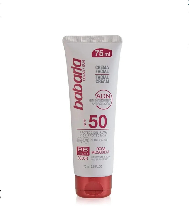 ضد آفتاب وBBکرم باباریا ضد پیری و ضد آلودگی هوا +SPF 50 حاوی عصاره گل رز ،یک کرم چند منظوره است که علاوه بر اینکه ضد آفتاب است یک BBکرم نیز می باشد.