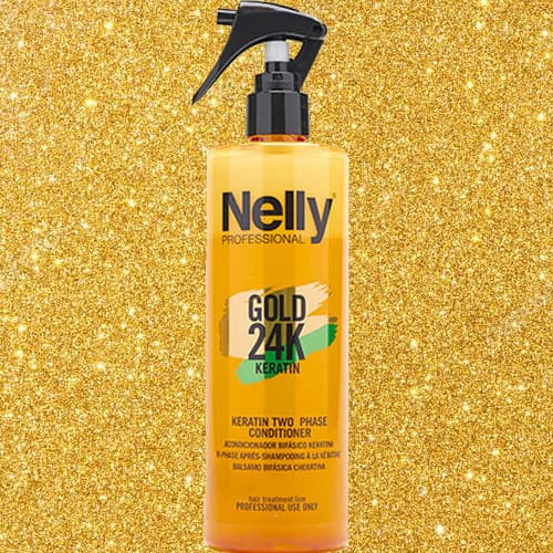 Nelly keratin Gold 24kاسپری دوفاز ترمیم کننده و تقویت کنند لاین کراتین گلد نلی پروفشنال400میل،