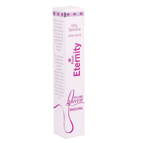 ریمل حجم دهنده Volume Queen رویال اترنیتی با داشتن برس خاص خود از نوع ریملهای حجمدهنده است که علاوه برحالت دار کردن مژه ها از چسبیدن آنها بهم جلوگیری میکند. موهای زبر و بلند برس باعث جدا شدن مژه ها و موهای کوتاه برس نوع متفاوتی از حجم مژ ه هارا نشان میدهد تا جایی که مژه های کوتاه و ابتدای چشم نیز از این خاصیت بهره مند می گردند