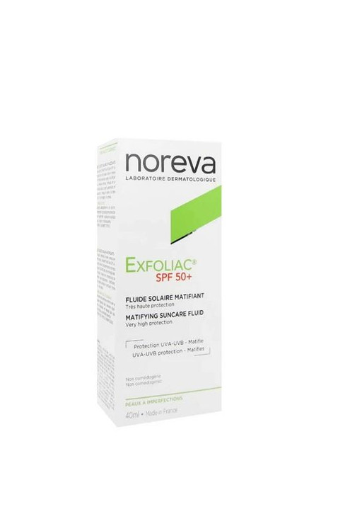 فلویید ضد آفتاب SPF 50 اکسفولیاک نوروا (Noreva Exfoliac Matifying Suncare Fluid SPF 50) محافظ پوست در برابر اشعههای UVA و UVB برای پوستهای چرب و جوش دار است. فلوید اکسفولیاک بی رنگ و فاقد پارابن بوده و علاوه بر پاک کردن پوست آن را مات نیز می نماید. فلوئید ضد آفتاب ⁺SPF50 اکسفولیاک دارای حداکثر حفاظت از پوست در برابر اشعه های UVA و UVB بوده و از پوست در برابر اشعه های مضر خورشید به خوبی محافظت می نماید. بافت این ضد آفتاب با وجود بی رنگ بودن به گونه ای است که پوست را یکدست می کند و با خاصیت مات کنندگی که دارد از براقیت پوست جلوگیری می کند. افرادی که پوست آنها چرب است، به دلیل چربی زیاد پوست در اکثر اوقات پوستشان برق می زند، استفاده از کرم های مات کننده به این افراد کمک شایانی می کند. فلوئید ضد آفتاب ⁺SPF50 اکسفولیاک حاوی مواد مرطوب کننده بوده و به همین دلیل برای تمامی پوست ها مناسب است. همچنین در برابر تعریق نیز مقاوم است. بافت سبک و فلوئیدی این ضد آفتاب سبب می شود که به راحتی بر روی پوست پخش شده و هیچگونه احساس سنگینی بر روی پوست به وجود نمی آورد.